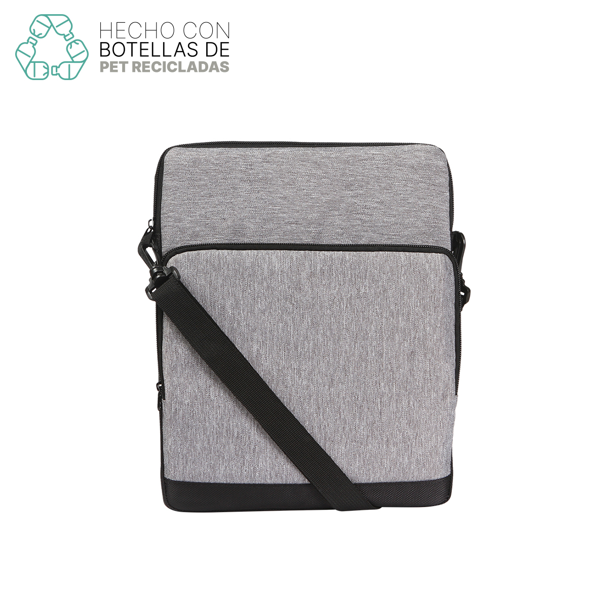 Bolsa multiusos fabricada en poliéster reciclado (RPET) y polilona, lo que la hace ecoamigable, resistente y capaz de soportar el uso diario. Adicional a su amplio compartimento principal cuenta con un bolsillo frontal espacioso y bolsillos traseros de malla, perfectos para guardar objetos de uso frecuente o de fácil acceso. Adicionalmente cuenta con una correa ajustable que puede retirarse y te permite llevarla cómodamente al hombro o cruzada en el cuerpo. El RPET es un material resistente y duradero que puede soportar el uso diario y el desgaste, lo que lo hace ideal para productos textiles. Además es sostenible porque utilizan materiales reciclados en su fabricación, lo que reduce la cantidad de residuos y disminuye el impacto ambiental. | Medidas: 30.5×25.4 cm.