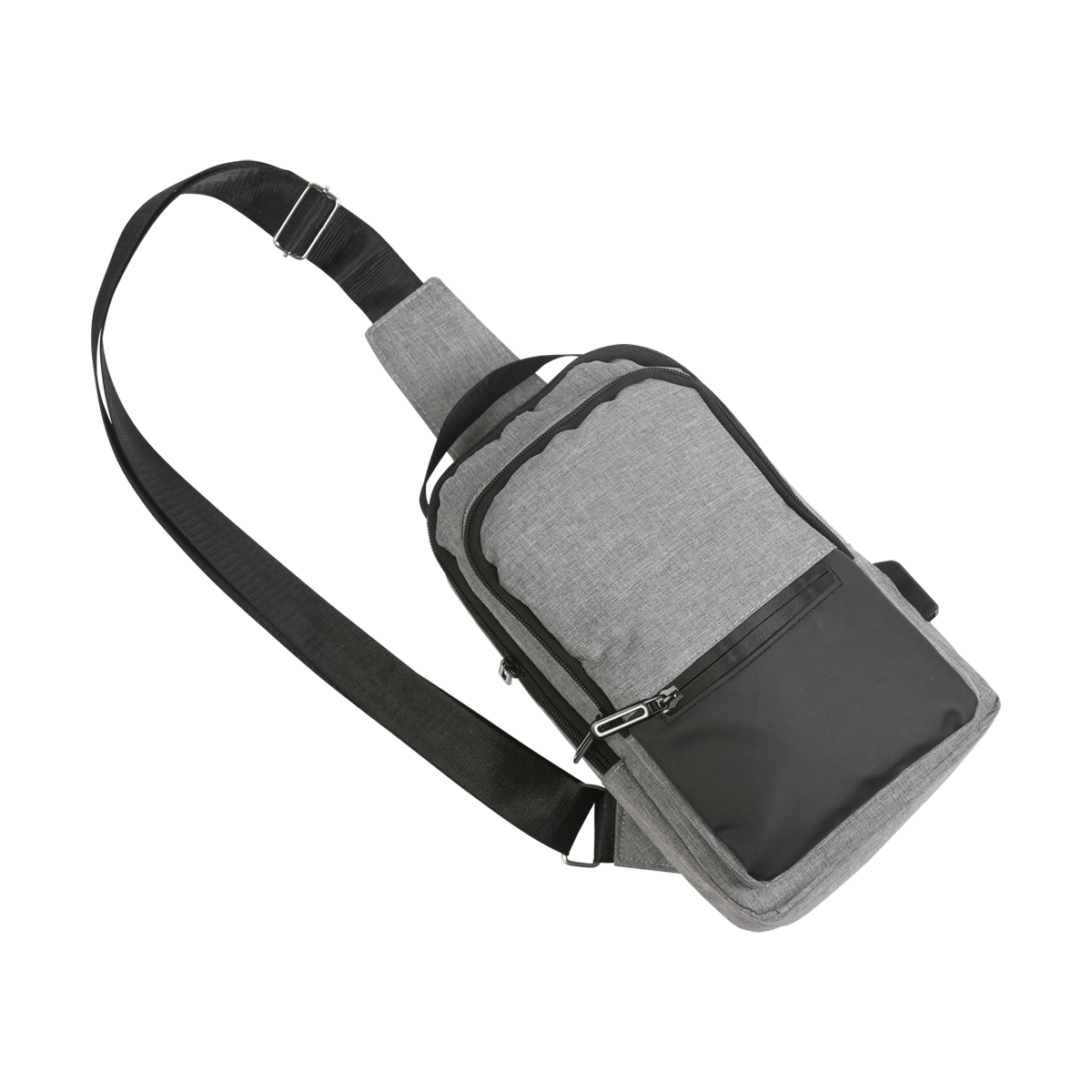 Mochila de hombro fabricada en poliéster, bolsillo frontal con cierre, correa ajustable, asa superior y puerto integrado para carga USB. Incluye cable USB. | Medidas: 28×18 cm.